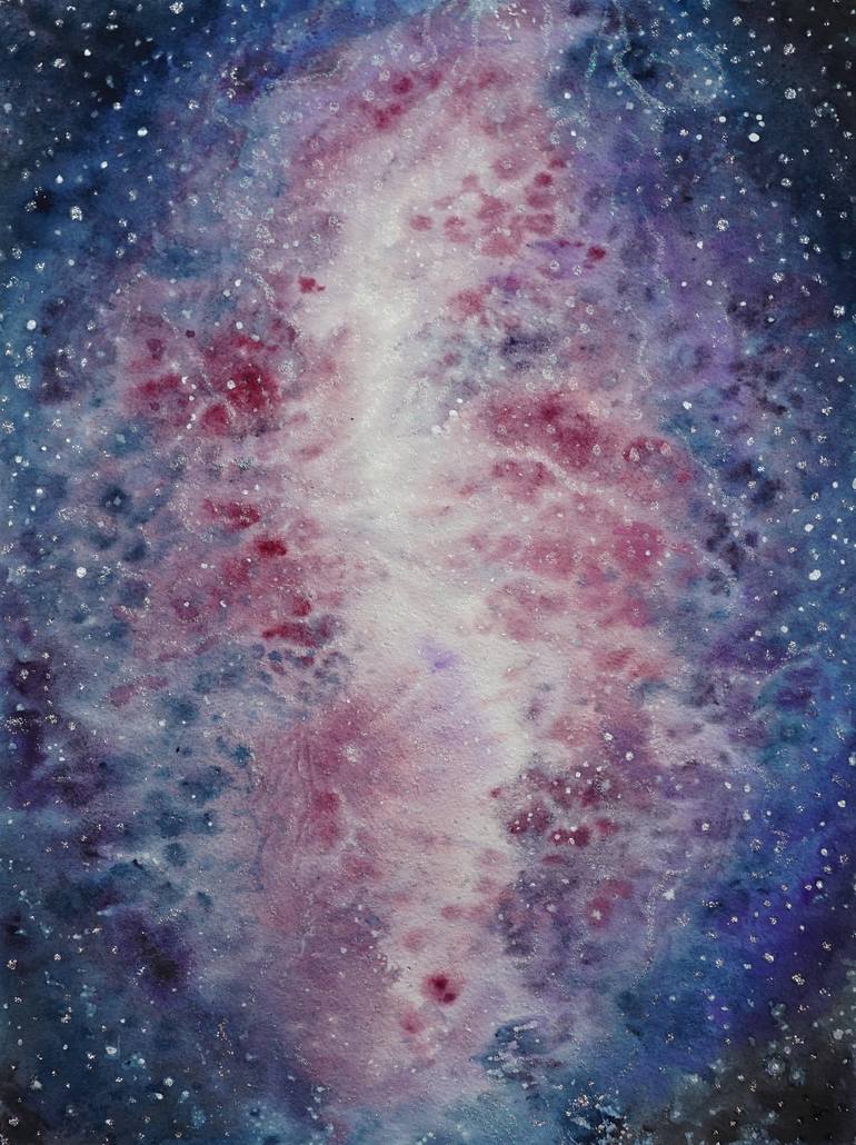 I have been inspired by the wonderful images of the Milky Way. In this case I represent the heart of the Crescent Nebula with an abstract result in blue and red, giving purple in its fusion. Rainwater, natural pigments, watercolor and holographic mica (for stars) on pure cotton Arches paper, hot p...