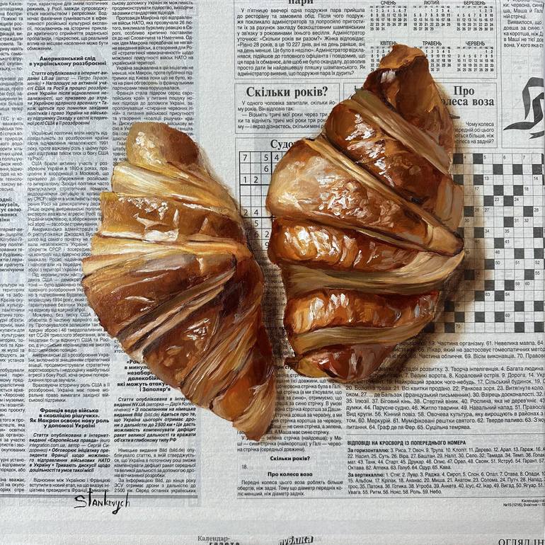 Croissants on newspaper on canvas by Julia Stankevych oil on primed newspaper on a stretched canvas 2024 Ukraine