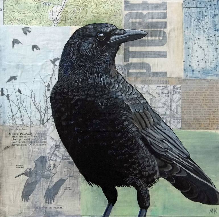 Vintage and found paper collage with John James Audubon inspired painting of crow. 10" x 10" x 1" cradled birch plywood panel, edges painted white, varnished, ready to hang.