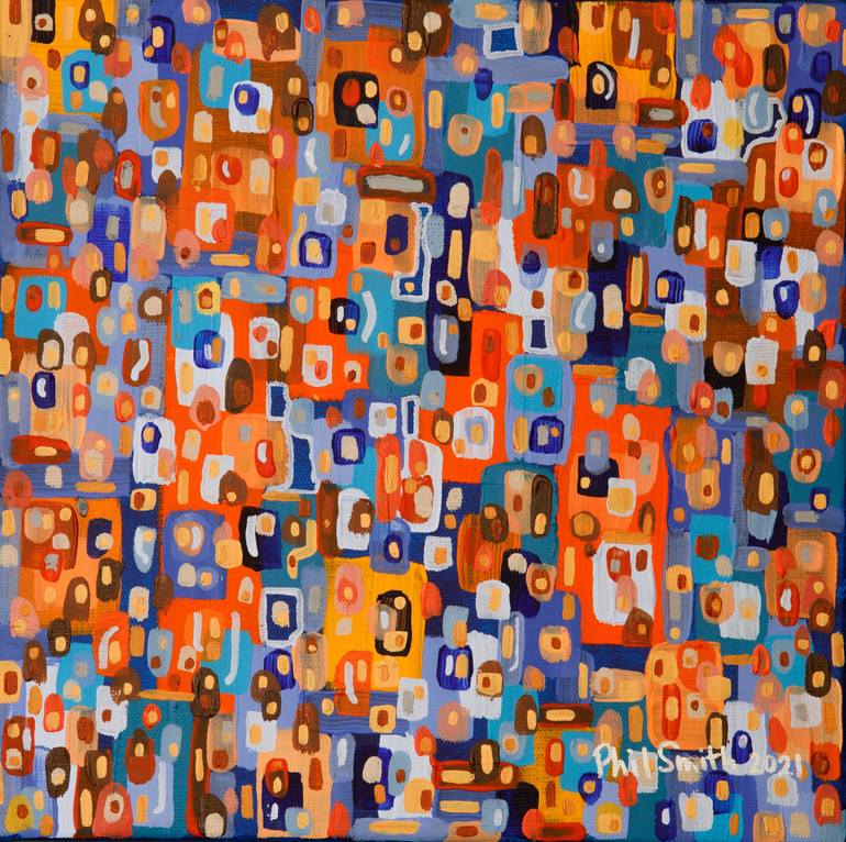 Crowded House is a small, dynamic abstract painting, with blues and oranges layered over each other to produce a complex and pleasing artwork. It would work well in a variety of settings, perhaps a gallery wall or on a small wall by itself in an apartment or older home. It is ready to hang.