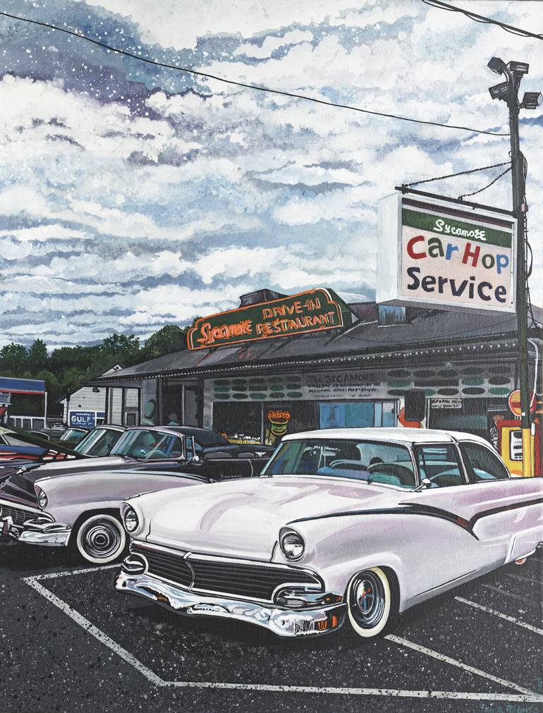 I grew up five minutes from the Sycamore car hop diner, and they have had cruise night events for antique cars during the warm months for decades. And the food is good as well. Wood strip frame stained charcoal, built by the artist.