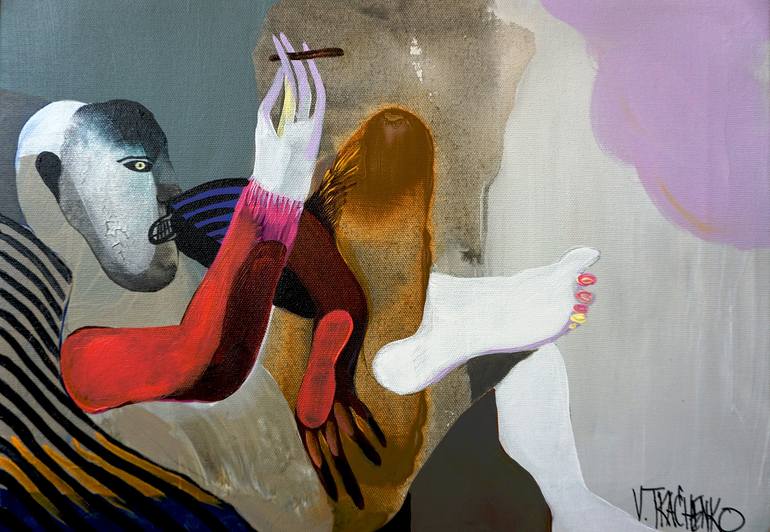 Victor Tkachenko, lives in Toronto, Canada. Victor received professional art training beginning at age ten and was one of few graduates to complete the extensive and rigorous program from the well-renowned Art School in Krivoy Rog, Ukraine. Working primarily with acrylic on board Victor displays a mastery of line and colour through purposeful brushwork and a palette dominated by rich earth tones thickly applied to the ground. The physicality of his work is enhanced with accents of ink and, intermittently, the addition of industrial materials such as varnish and plaster. Throughout the various stages of his work, Victor’s figurative forms are drafted with elongated lines, exaggerated features and geometric patterns. While early paintings are recognizable for their use of solid line and bold colour that refer to Byzantine mosaic work or stained glass, his oeuvre is grounded, broadly, in symbolism and expressionism. Dominating his art are planes of soft light which intersect and overlap, objects and figures emerge from a dreamlike atmosphere of harmonious colour while emotion and meaning are conveyed masterfully through bold pattern and vivid line. Victor’s work can be found at galleries and private collections all over the world.