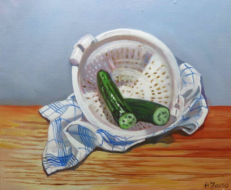 Still life with a a cucumber, a tea-towel and a colander on a wooden table. Anne Zamo seeks to share the beauty and daily wonders surrounding us and that we do not always know how to look at, to make us dream by being inspired by nature, everyday objects or emotions that she feels: butterflies, ins...