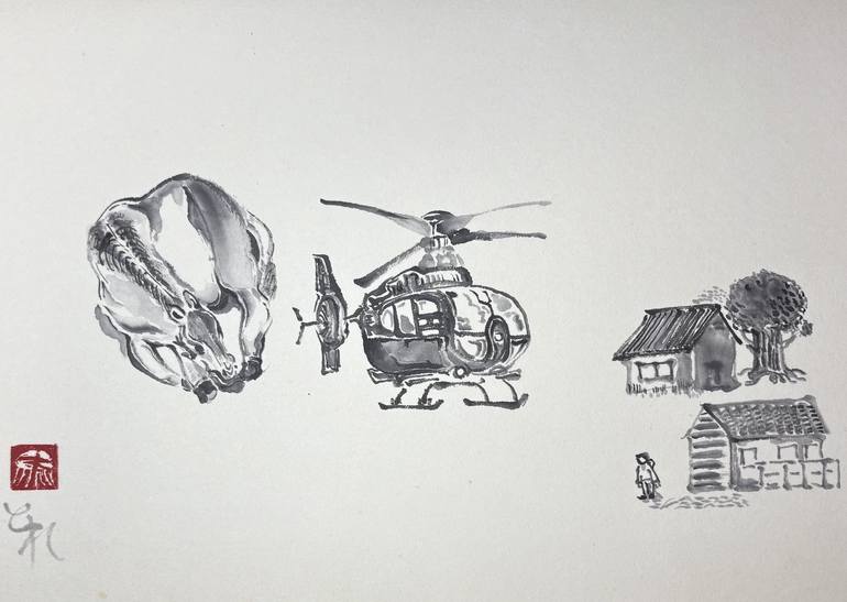 Horses and helicopters can be means of transportation. And a couple of houses, one with a tree besides it, the other with a person standing just right next to it. My chain of thought created this juxtaposition.