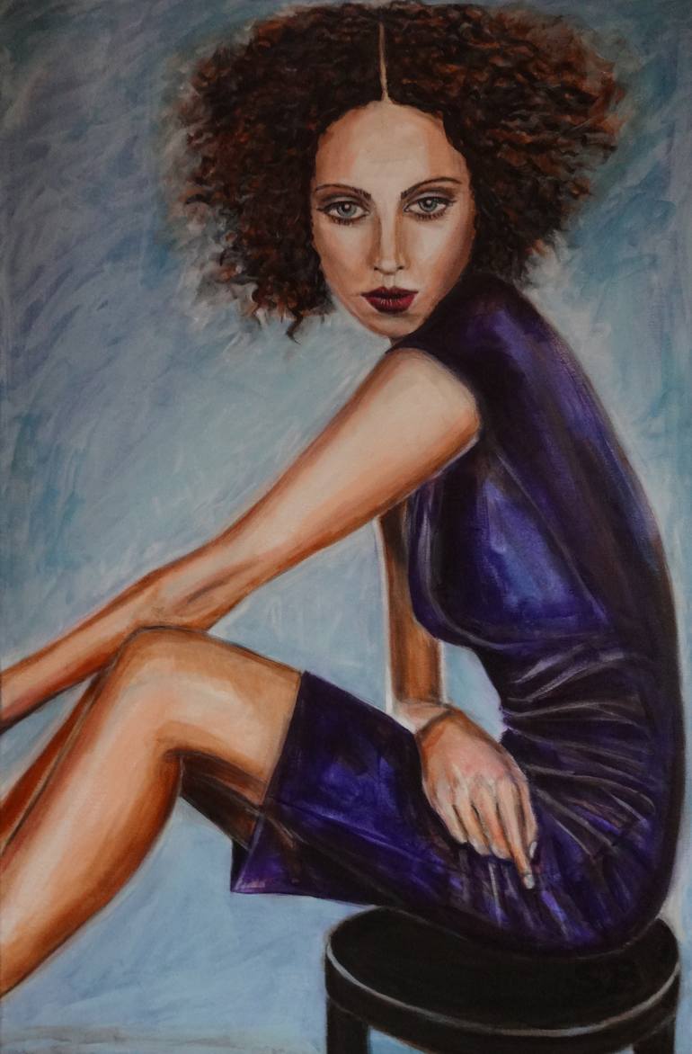 A young lady with curly hair and a mini dress sits on a stool, focusing on the viewer ...