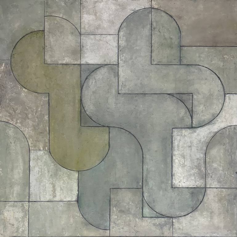 Curveball #8 continues the exploration of curved shapes within a geometric composition, a defining characteristic of the Curveball series. This 20-inch square painting features a subtle palette of green-gray and off-white tones, creating a quiet yet dynamic interplay of form and depth. A primary sh...