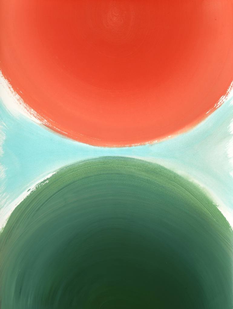 Two elegant balance are depicted with momentum of circles. Simple, harmonious, and restful. Acrylic on French Arches paper. Two panels, each piece is 30 x 22 inches. Can be displayed together or separately. Ready to frame. This is No. 2.