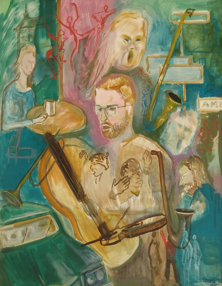 This piece was inspired by jazz music. The face in the middle is self-portrait.