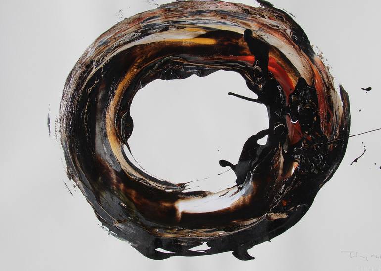 Inspired by perfect circles in Oriental art. A mixture of Acrylic paint, Chinese Ink and Varnish was painted with a spatula. The work consists of three different circles on three different papers, Caballo 250 gr. 50 x 70 cm.Total width without frames 210 cm.
