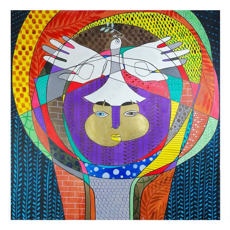 -illustrazione contemporanea a colori di donna e colomba con ulivo -i tratti e lo stile sono unici originali e di mia fattura -il disegno è realizzato su carta fabriano 100% cotone 300 gr con inchiostro di china -firmato sulla parte frontale -le dimensioni totali sono di 56 x 56 cm -l'opera viene s...