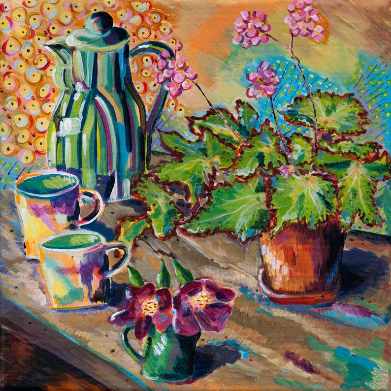 The colours of my mothers Denby Ware jug seemed to go so well with the flowering begonia in my conservatory I decided to make a still life painting of them. W 12.00" x H 12.00" D 1.50" Media: acrylic Surface: Acrylic on Box Canvas. Ready to hang.