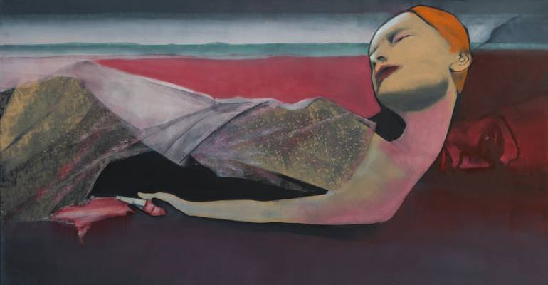 According to a story by William Shakespeare, Othello killed his wife and later himself from jealousy. I painted her gently sleeping on her husband, who still holds her hand, in delicate colors and patterns