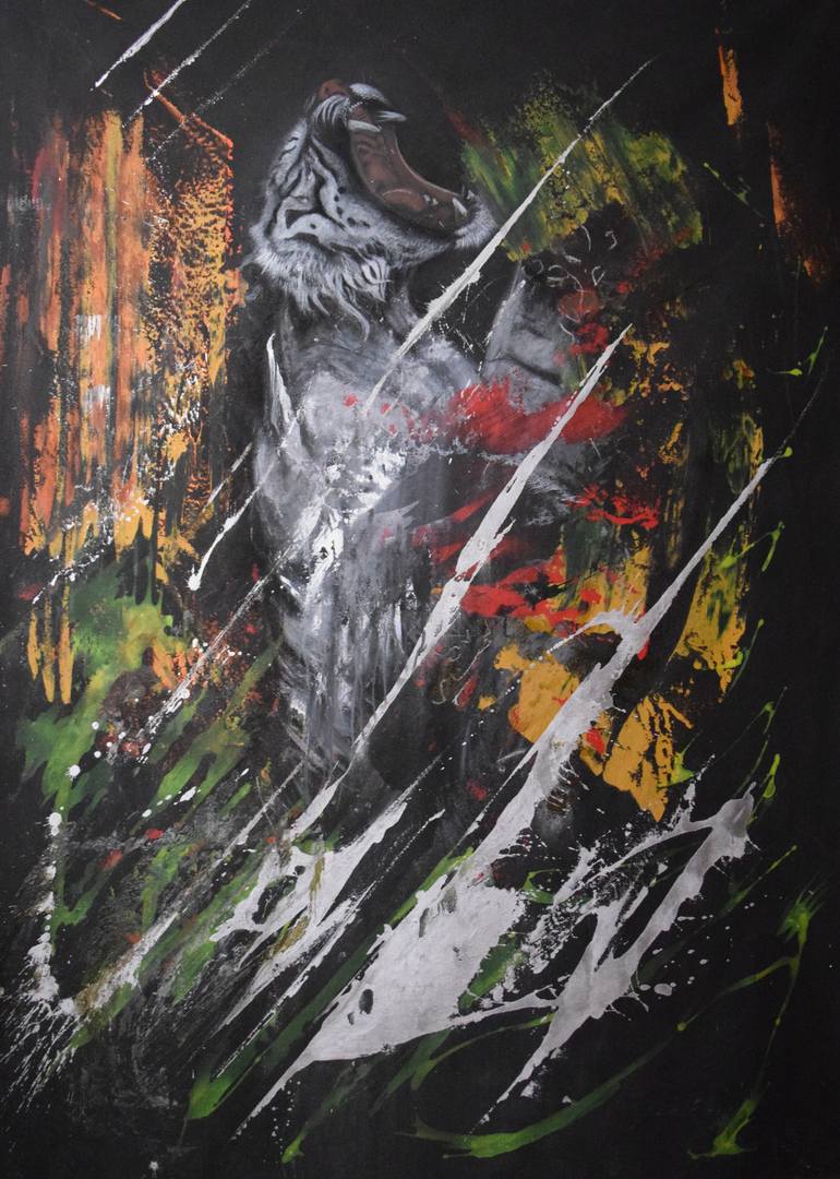 Acrylic, mixture, oil panting and charcoal on canvas without board. Figurative expressionism inspired in white tiger.
