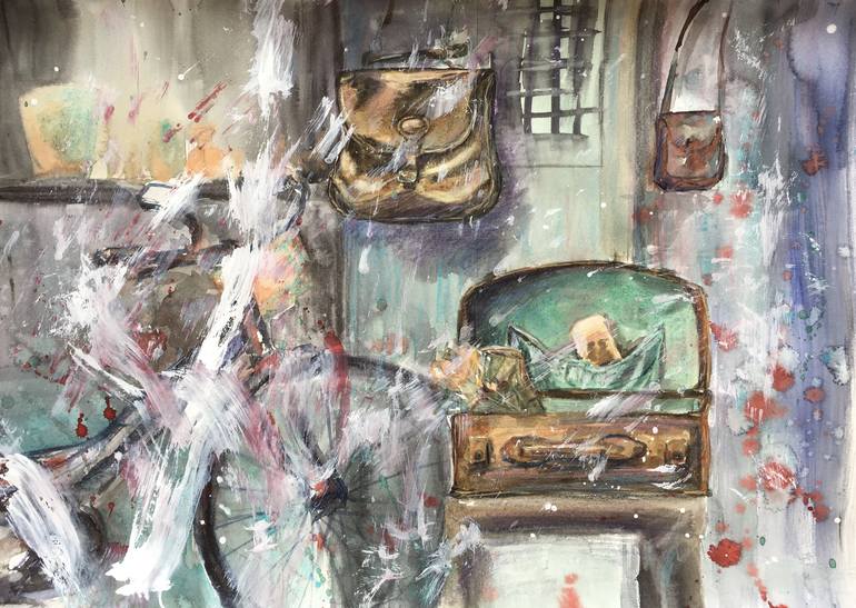 This watercolor painting exudes a sense of nostalgia and intrigue, blending everyday objects into a vivid and dynamic composition. The artwork captures a corner filled with layered memories: a weathered bicycle, a worn leather satchel hanging on the wall, and an open suitcase revealing glass bottles...