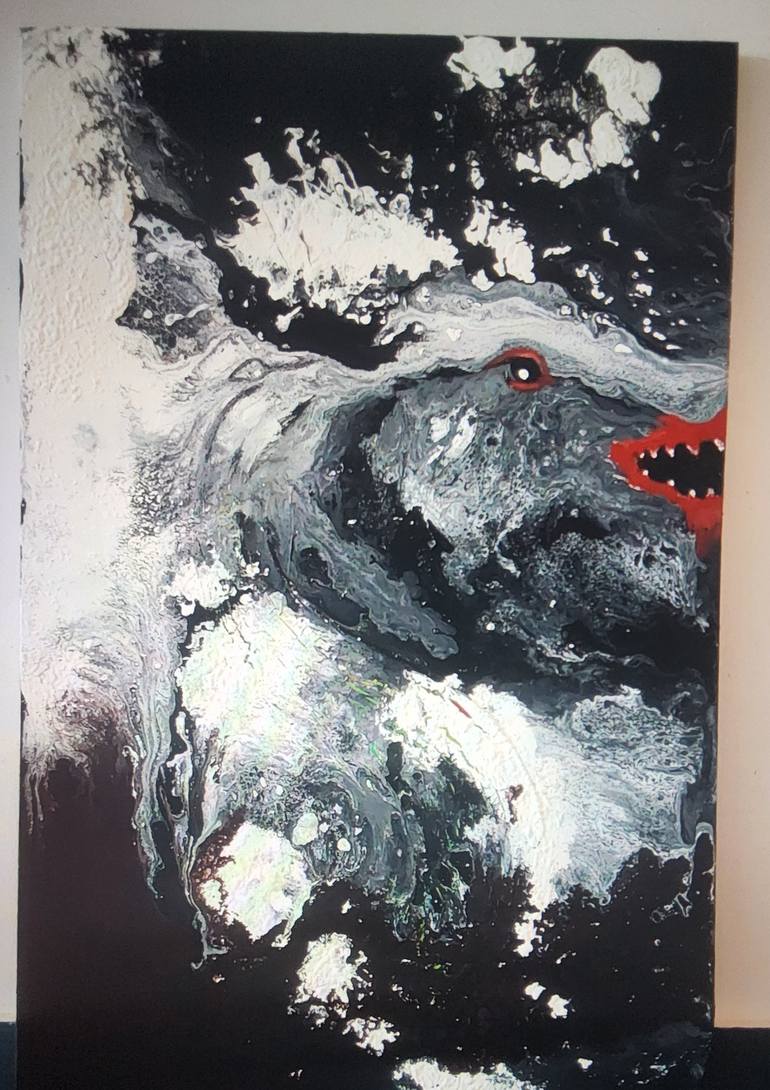 DRAGON, this is original acrylic painting on quality of canvas, by asian art made, by pouring with acrylic paint on canvas, mixed with the water, last glossing and framed with the silver color I'm art collectors, sell on saatchi to inspired me to sell my collection artwork