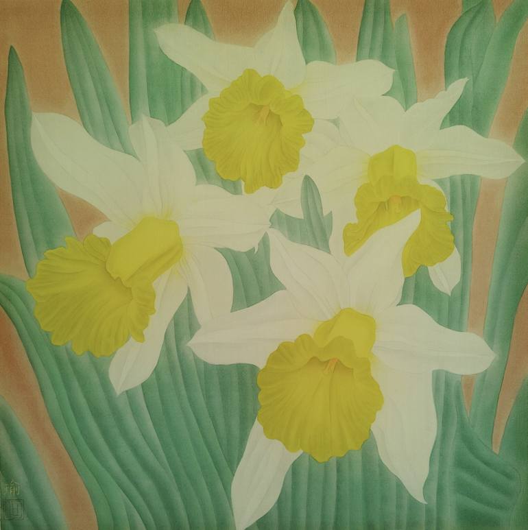 "Daffodils," a captivating floral painting, draws inspiration from Georgia O'Keeffe's iconic works, echoing her delicate brushstrokes and portrayal of the flower's enigmatic beauty. Created with traditional Chinese painting techniques, the artwork employs ink and color on silk. The silk's inherent ...