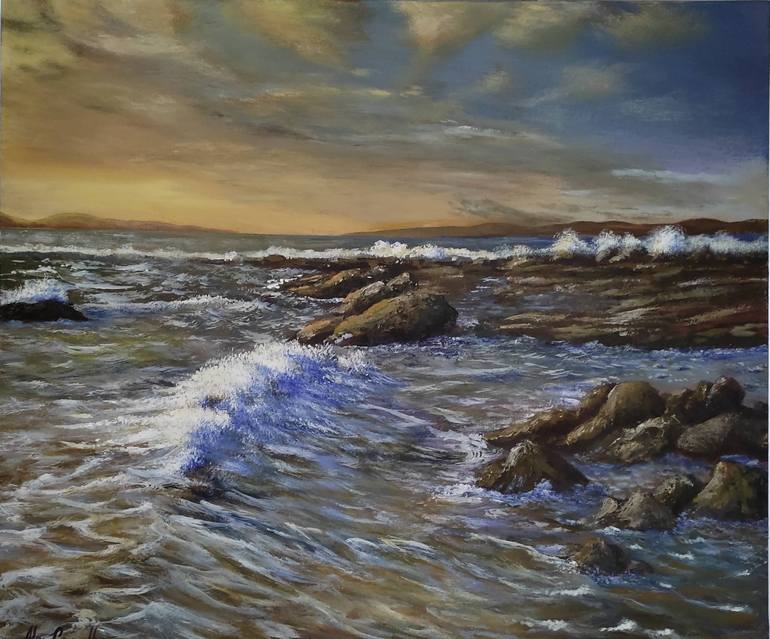 Autor: Alex Carvalho Ano: 2022 Técnica: Acrílico sobre tela Medidas: 60x50cm Série: Paisagens Descrição: Pintura de uma bela paisagem marinha com ondas e rochas e um lindo pôr do sol ao fundo