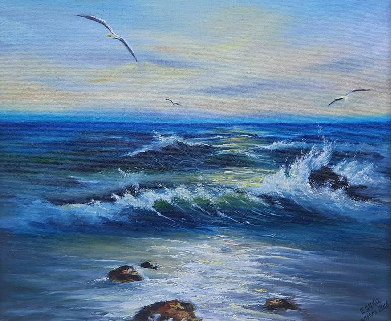 Original Oil Painting on Canvas "Dance in the Sunset", 2016 Series "Conversation with Nature" I can watch the waves and the sunset forever. This picture is about silence and tranquillity, about harmony with yourself and with nature. I see the dance of seagulls and the surf in the sunset and hear th...