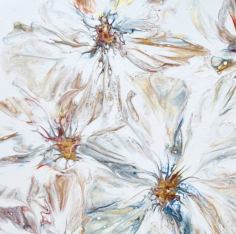 Celebrate the delicate beauty of nature with "Dance of Petals" by Yurij Pankevich. This 65x65 cm 2024 painting radiates elegance through its intricate floral forms in soft whites, earthy browns, golden yellows, and touches of vibrant blue. The textured petals appear to dance across the canvas, creat...