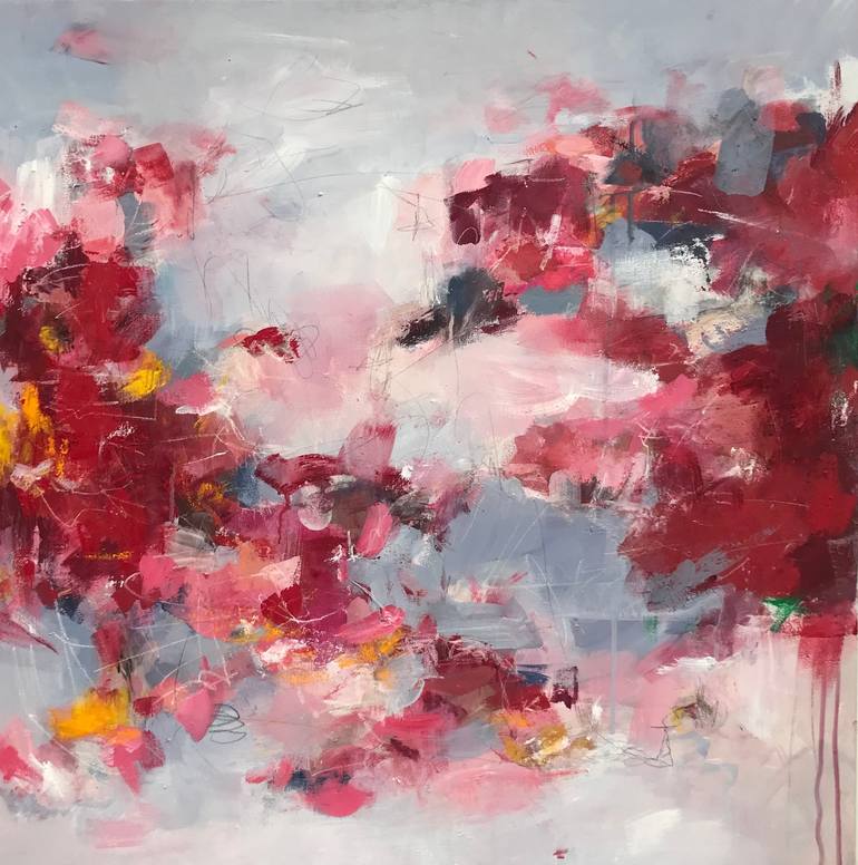 This vibrant, large abstract painting grew out of a slow process; it was built over many layers of paint creating a beautiful deep texture. The starting point for this piece has been the colour scheme of strong reds. The playfulness of the painting attempts to capture a mood of lightness, joy and an...