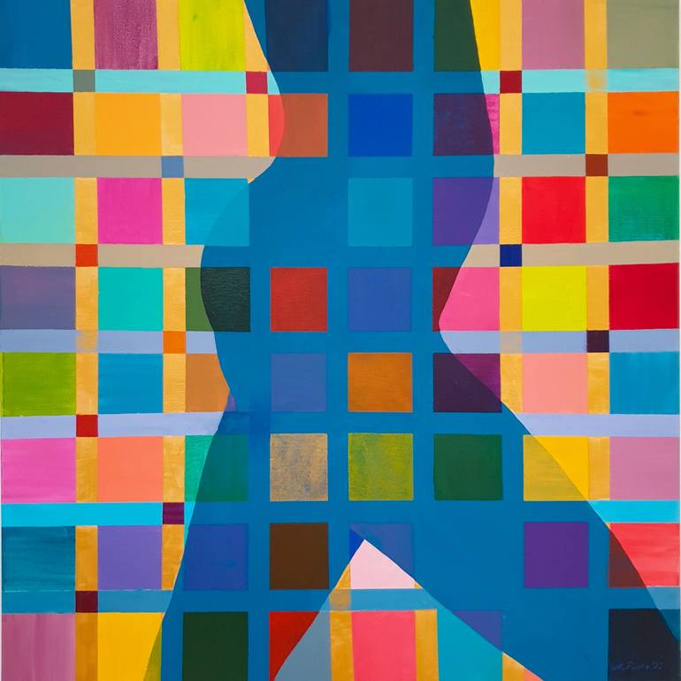 A very colorful picture, flickering with rhythms of colors like lights in a disco. Color contrast, sharp edges of squares and small squares. Acrylic on canvas, sides painted, ready to hang.