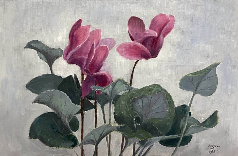 While I was painting these pink cyclamen, their flowers and leaves were constantly moving. That is why I named this painting Dancing Cyclamen. This artwork is created from life with oil paint on paper for oil painting Fabriano Tela. This paper is acid-free and archival, 300 gsm. Only high-quality ma...