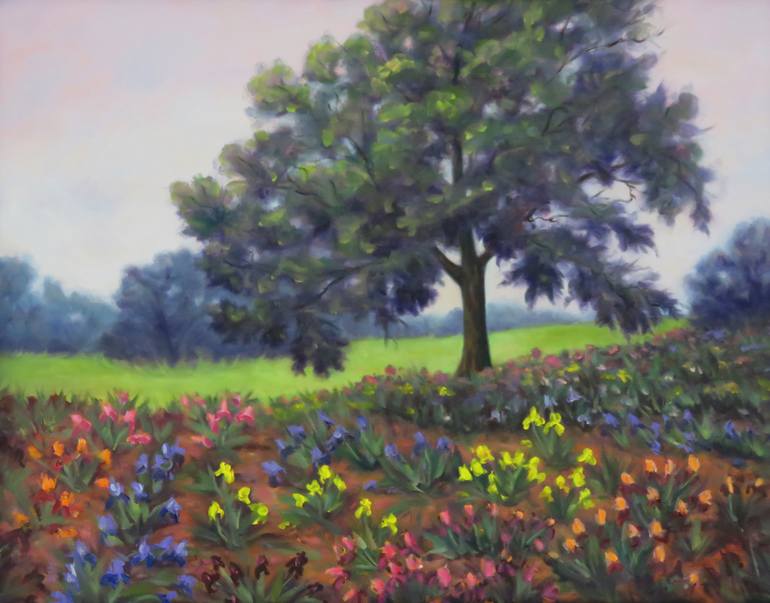 A few years ago a friend invited me to go with her to an iris farm not far from where we live. The irises were in full bloom and the property was very beautiful out in the country. I chose several irises and they dug them up for me to take back to my yard and plant. This painting is of the iris farm...