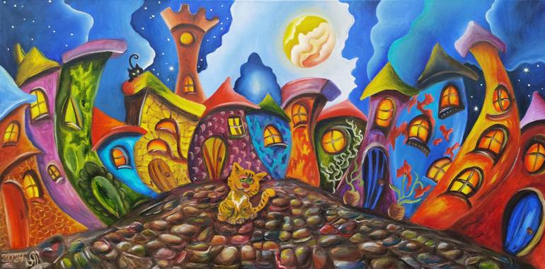 Step into a whimsical wonderland where imagination knows no bounds! This enchanting oil painting on canvas transports viewers to a magical realm filled with vibrant colors and fantastical architecture. A charming cat takes center stage, perched on a cobblestone path that winds its way through a vill...