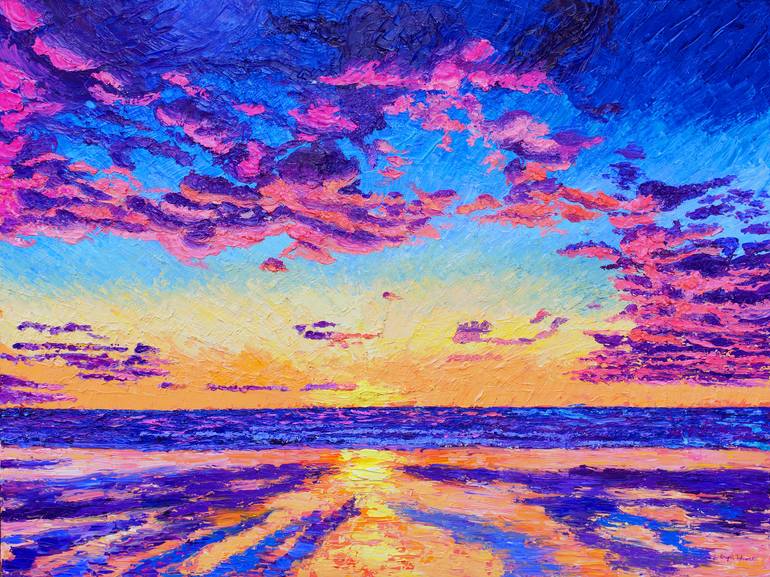 The original oil painting, 36 x 48 entitled Dancing Skies, was painted on canvas, in the city of Portland, Oregon, in July 2018. Sunset Clouds dance over the Oregon Coast near Manzanita, casting their warm glow on the sands below. This painting was created on 1/2 inch cradled canvas, and wrapped ...