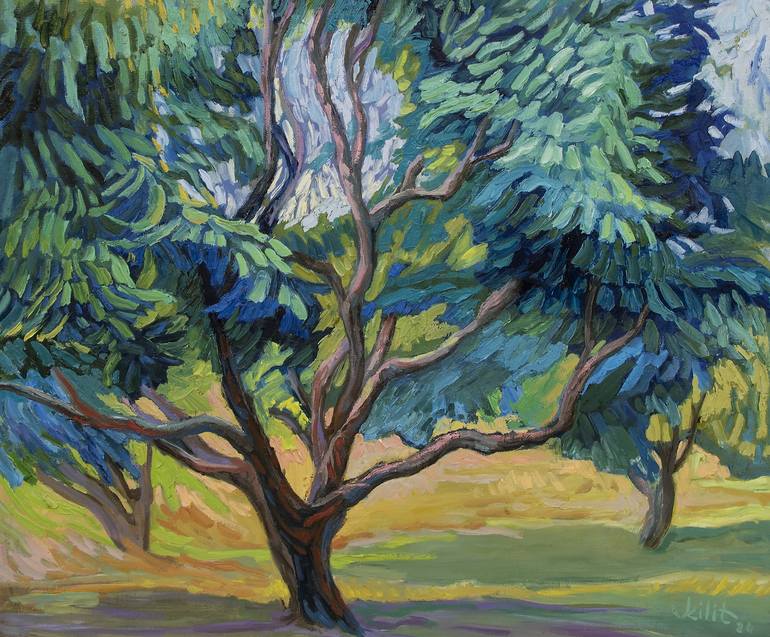 In Dancing in the Breeze, I capture the fluidity and vibrancy of nature with expressive, textured brushstrokes. The composition highlights a tree swaying gracefully, surrounded by lush foliage that radiates in shades of blue and green. Sunlight filters through the branches, casting a warm glow over ...