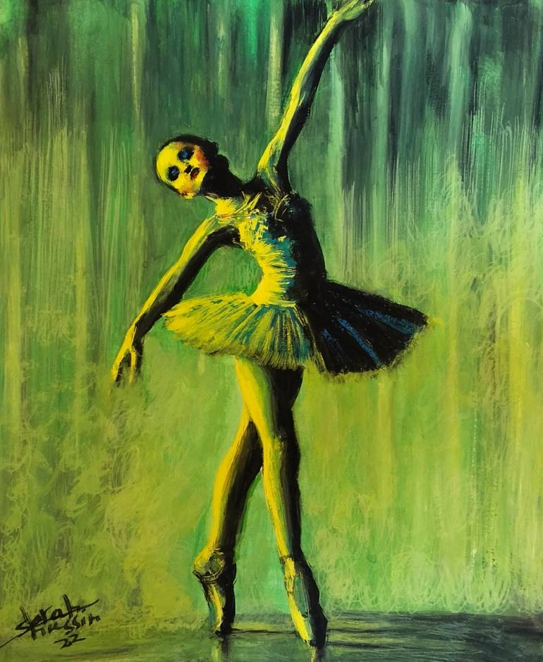 It's a painting of a ballerina dancing solo . Gouache colours on paper