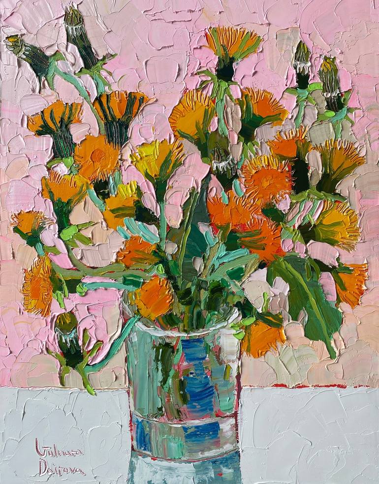 The painting "Dandelions" is painted in oil on canvas with a palette knife