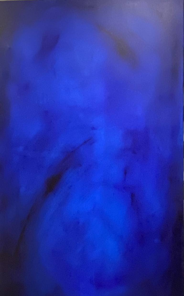 Un travail de couleur, un faux monochrome, toutes les nuances de bleus sont utilisées en superposition, en melange pour apporter vie, lumiere et profondeur Un verni mat pour la proteger Système d accroche Laissez vous emporter dans ce voyage aquatique