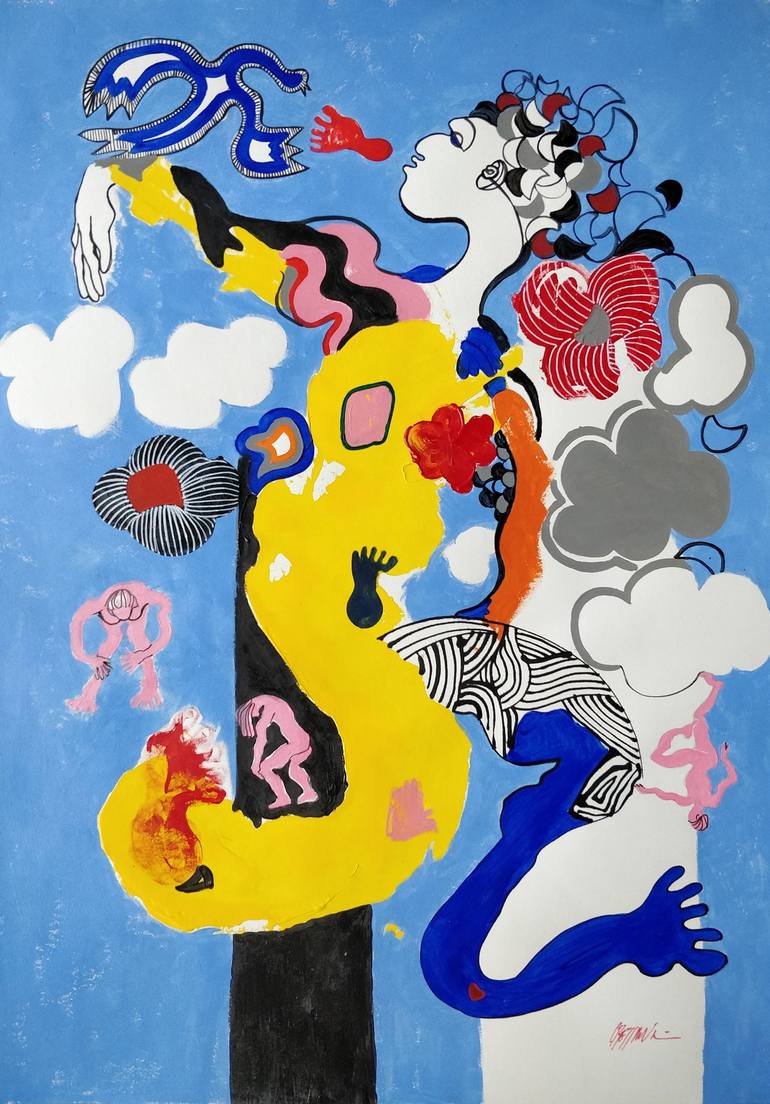 painting danced between joy and dream The artist Cressanne explores the elusive dreams that we imagine over the years. This one is a joyful dance between the birds, the feet, the flowers and multiple bodies on a furious rhythm. The paper has a natural white made without acid that guarantees excellen...