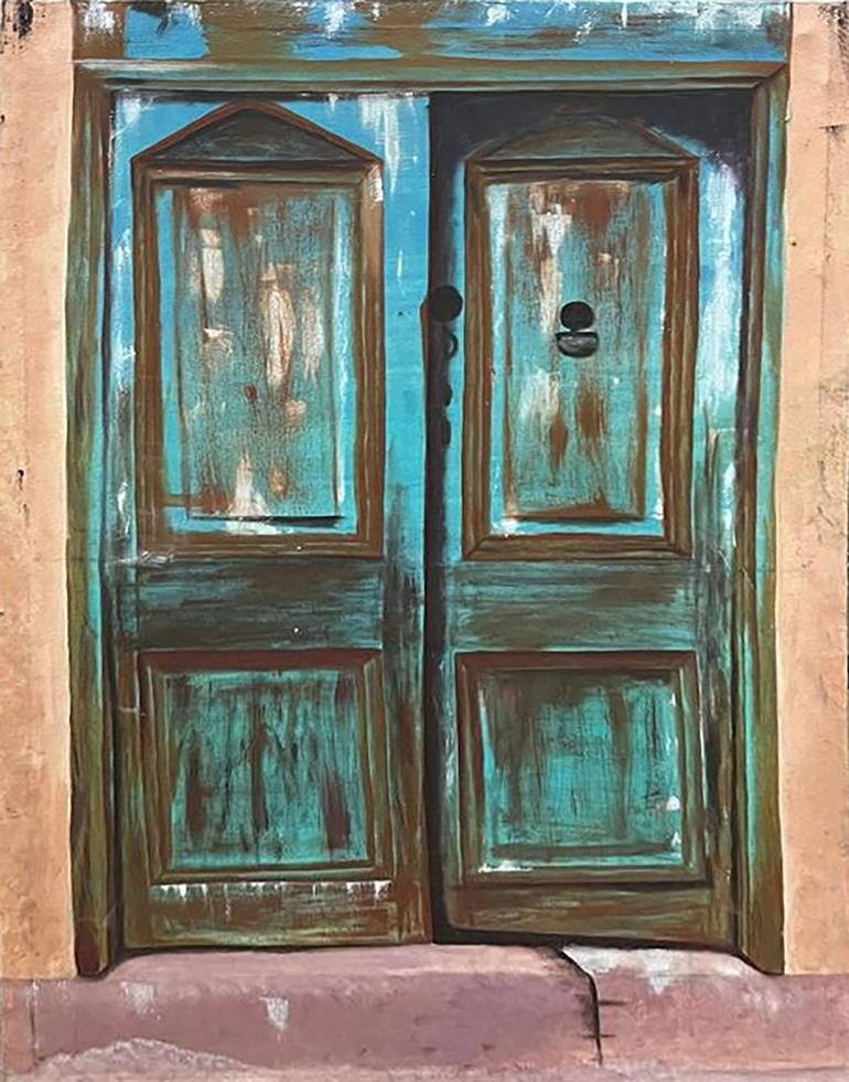 The painting depicts a rustic, weathered double wooden door with a distressed turquoise and teal finish, revealing brown patches beneath. The surrounding frame is in beige and brown tones, and the base shows a cracked pinkish-brown step. The doors feature raised panels and two keyholes, creating a v...