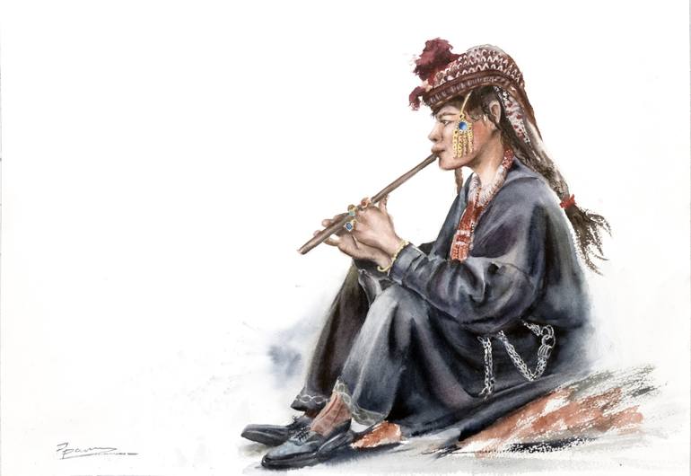 Dardic musician - Original Watercolor Painting Signed front and back Dated on the back. Not framed. I read the article about Kalasha, and saw the photography which inspired me to painting artwork. Unfortunately, I do not know the name of the photographer. Materials watercolor paints and Top brande...