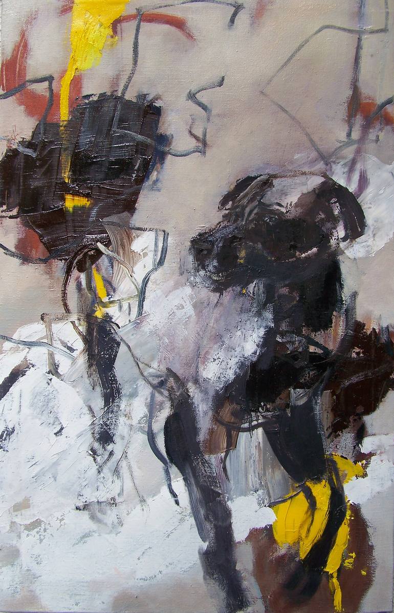 the source of this painting is a novel by Ian Mc Ewan by the title of Black Dogs . In addition there is a film still by Andrei Tarkowsky with a sinister athmosphere . Movement and physical presence of a dog plus a sense of the underlying "wild beast" nature are theme of this painting.