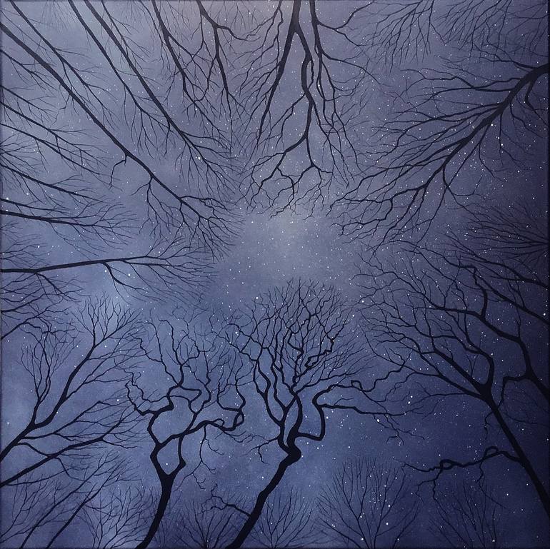 Reserved... Back signed. Framed in a black floating frame and ready to hang: Subject matter continued on the canvas sides "Moving back to France after 15 years in the tropics, I was awakened by the beauty of the leafless trees of winter and got inspired by the embroidered like abstract patterns. For...