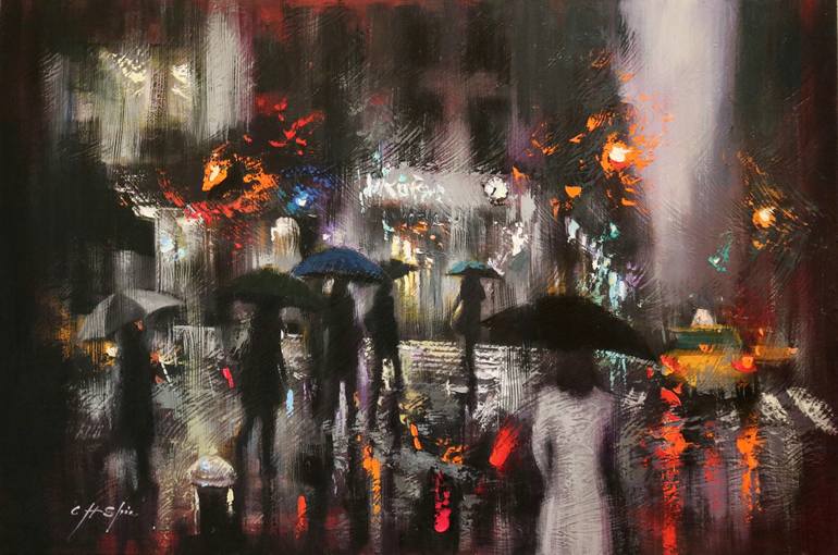 Oil on Canvas 24 x 36 x 1.5 inches from New York city this painting is my ongoing study of Rainy day series I am looking for some positive energy by adopting dark rainy day as possible bridge between my inner desire and what is really happening actual scene here is from Fifth avenue New York C...