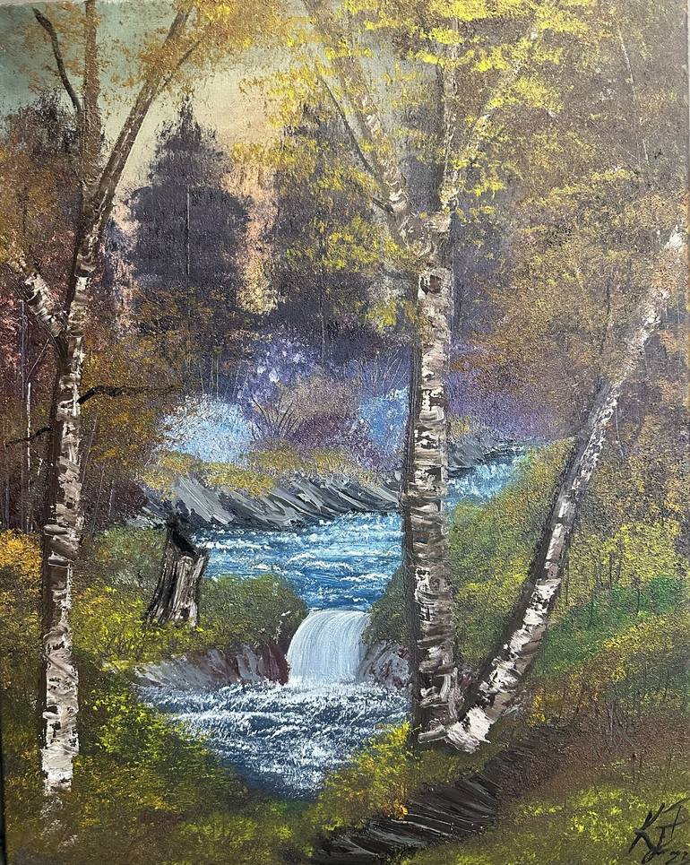 This painting is inspired by Season 7 Episode 13 of The Joy of Painting with Bob Ross. He called this "Dark Waterfall." I have been on a journey learning to create Alla Prima or Wet-on-wet oil paintings. I am continuing to grow and learn my own style within Bob Ross's signature style.