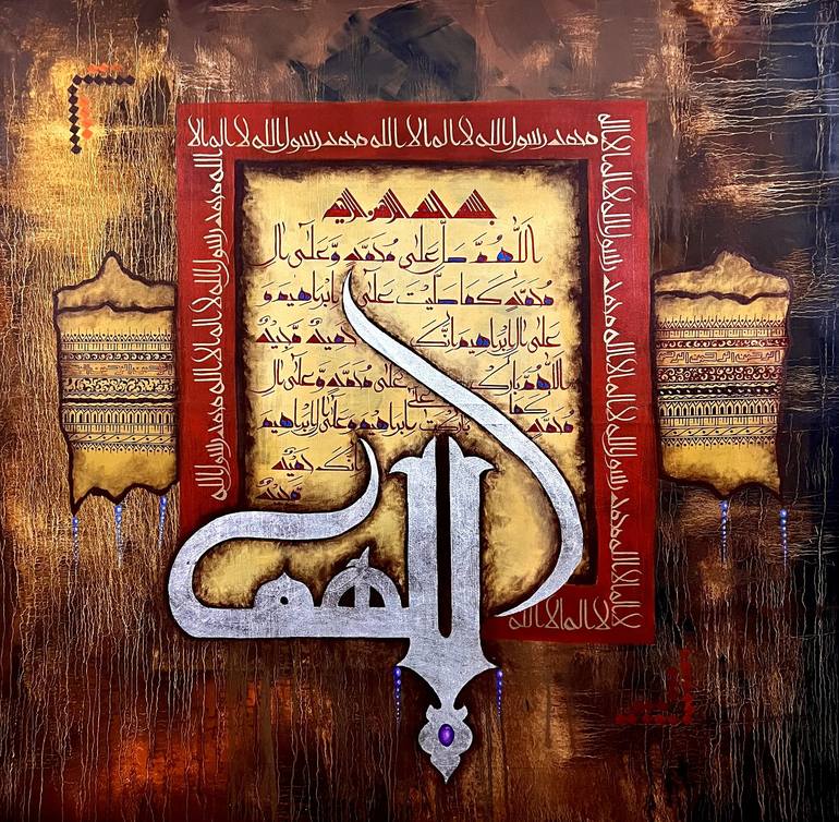Arabic calligraphy written in Darood sharif in Kufic style calligraphy use on silver leaves taxture background for entike colour