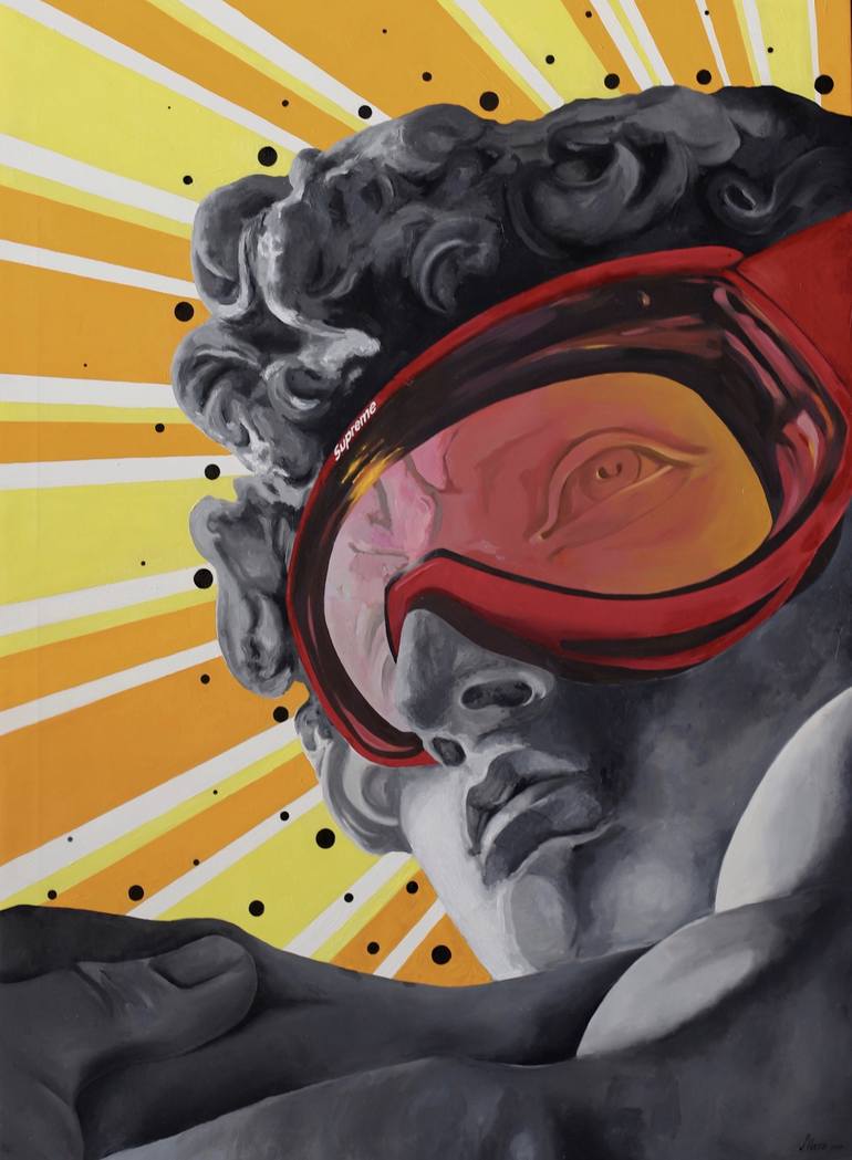 I named this series of paintings “Fashionistas in Stone”. This painting is based on the marble sculpture “David” by Michelangelo. David is the embodiment of perseverance, sheer willpower mental strength. David’s focused gaze is directed upwards, looking past the assumed Goliath and towards victor...