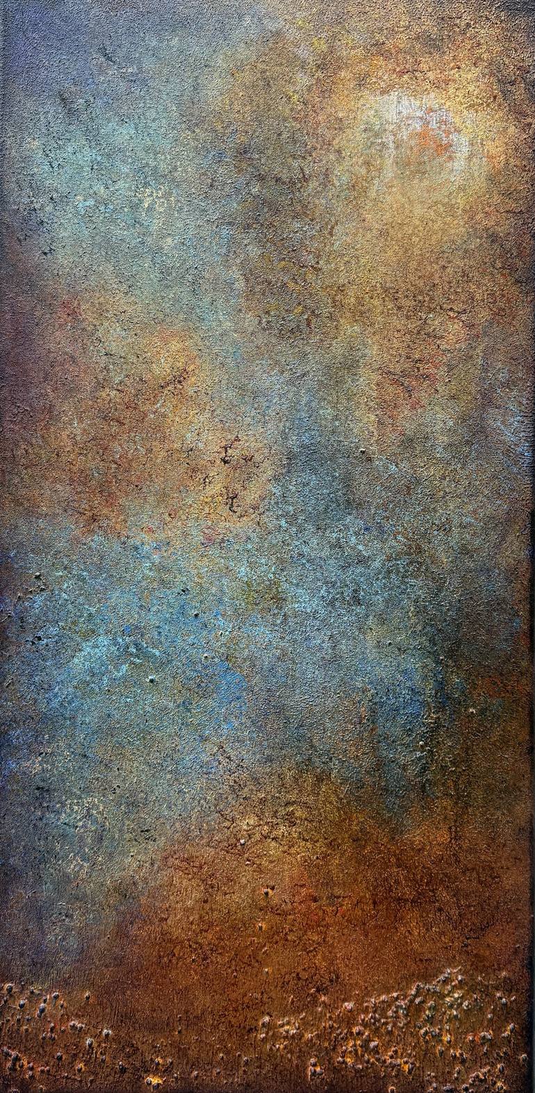 This abstract painting evokes the feeling of soft light breaking through morning mist or haze. The gradients of golden-brown, blue, and ochre tones flow harmoniously into one another, reminiscent of the meeting between night and day. The upper part of the artwork is illuminated by a muted glow, whic...