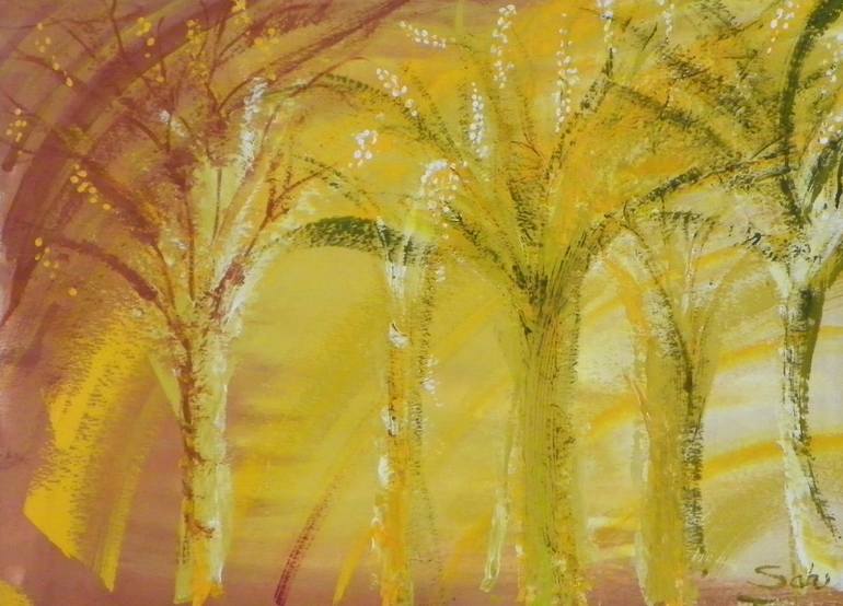 "How light filters through trees and make the forests more beautiful. A colorful dawn in the forests inspired me to make this painting. This is a unique piece of work with use of few colors to create the effect- the dawn in the forests."