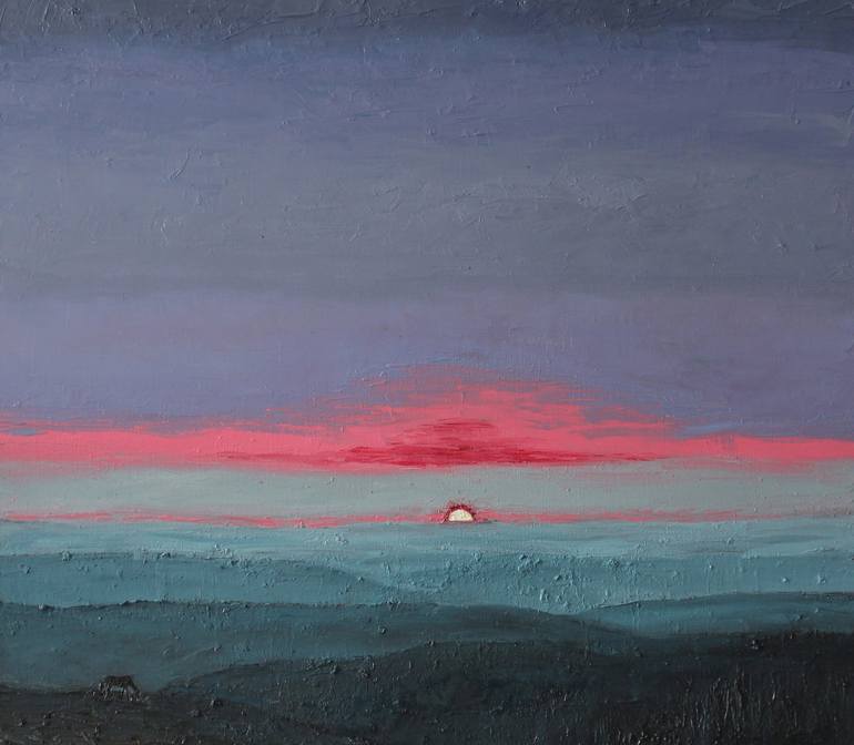 This is the second painting from the “Three Landscapes” series. Landscape fantasy, dawn, when the sun has just barely appeared over the horizon and does not yet illuminate the earth, but only paints the sky pink.