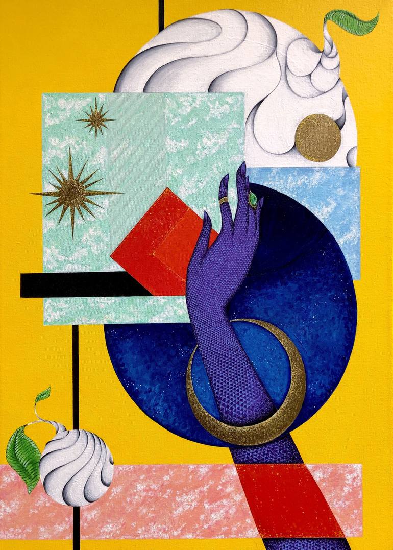 Acrylic on canvas. 50 × 70 × 2 cm. Unframed. In “Day Dream,” sunlight dissolves form and thought into radiant geometry. A violet hand reaches through shifting planes of colour — a symbol of awareness exploring the borders between waking and dreaming. This work captures the warmth and clarity of su...