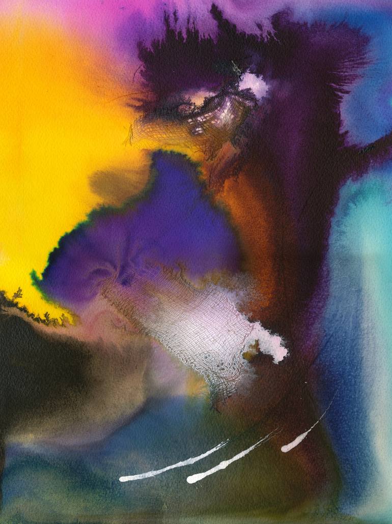 Watercolor Ink on canvas with threads of gauze. Playing with materials to portray flow and a sense of abandon. I leave it up to your own day dreams for inspiration.