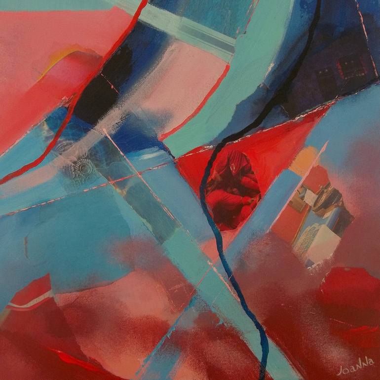 The eternal game of colours and textures. Acrylics with collage on canvas. Contrasts in red and blue. The other side of day and night.