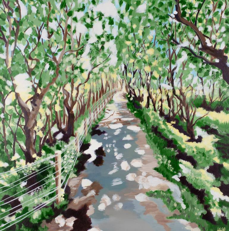 I made this painting (60 x 60 cm/23.6 x 23.6 in.), which is part of my Forest Series, in the summer of 2020 while I was staying in De Haan, a seaside town in Belgium. During my daily walks, I was inspired by the light shining through the forest trees and the contrast of its dancing shapes and shadow...