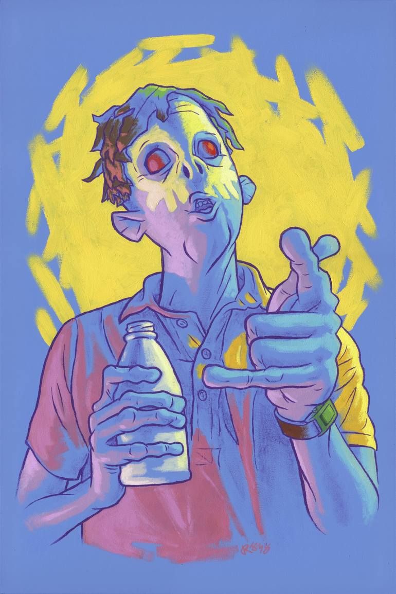 This one was inspired by techbro culture and how it results in products like Soylent. There is no frame, since the background color wraps around the sides of the canvas.